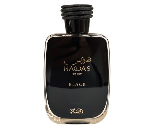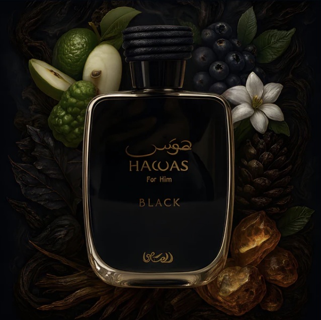 Hawas Black by Rasasi on aromaattinen hedelmäinen tuoksu miehille. Tämä on uutuustuoksu, joka lanseerattiin vuonna 2024. Alkunuoteina tuoksuvat bergamotti, ananas ja greippi; sydännuotteina patsuli, setripuu ja jasmiini; pohjanuotteina tammen sammal, puun sävyt ja ambra.